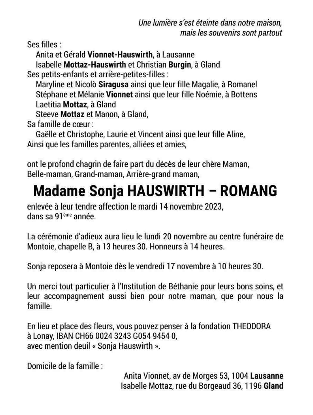 Madame Sonja HAUSWIRTH - ROMANG 24 aoû. 1933 - 14 nov. 2023 Avis mortuaire PFG Télecharger PDF Partager sur: Galerie PreviousNext PreviousNext