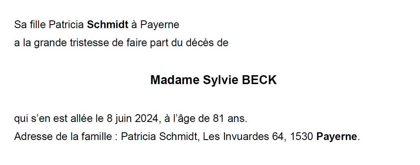 Madame Sylvie BECK 12 avr. 1943 - 08 juin. 2024 Avis mortuaire PFG Télecharger PDF Partager sur: Galerie