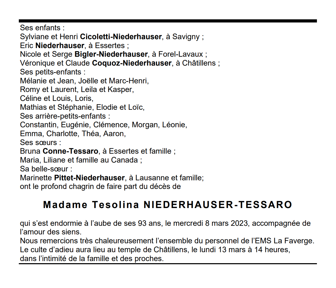 Madame Tesolina NIEDERHAUSER-TESSARO 09 mar. 1930 - 08 mar. 2023 Avis mortuaire PFG Télecharger PDF Partager sur: Galerie PreviousNext PreviousNext