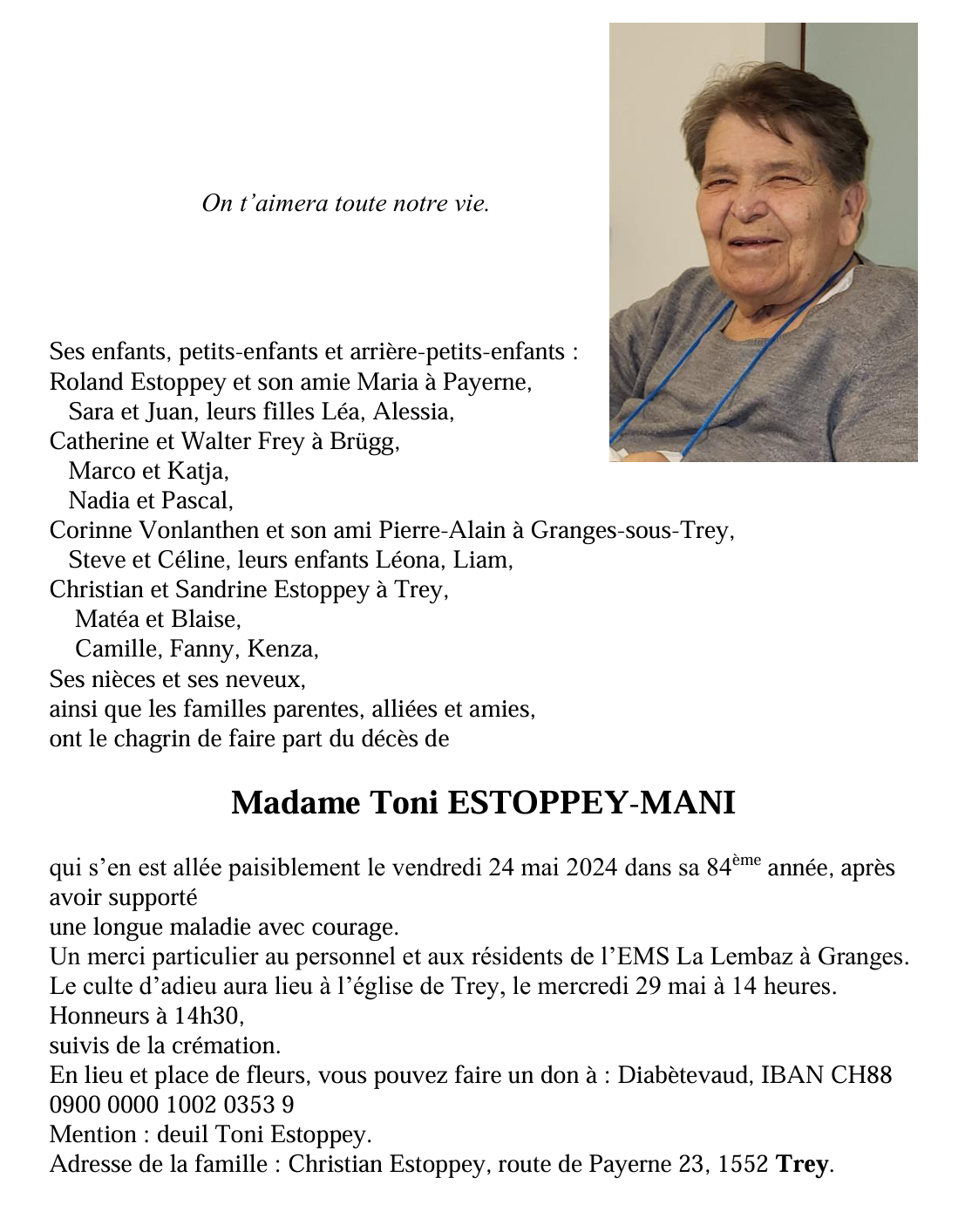 Madame Toni ESTOPPEY-MANI 15 sep. 1940 - 24 mai. 2024 Avis mortuaire PFG Télecharger PDF Partager sur: Galerie
