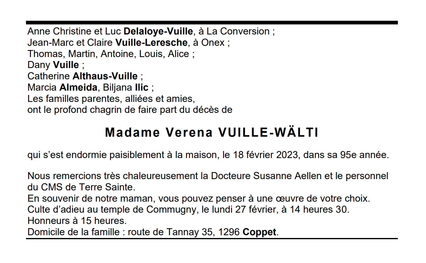 Madame Verena VUILLE-WÄLTI 09 sep. 1928 - 18 fév. 2023 Avis mortuaire PFG Télecharger PDF Partager sur: Galerie PreviousNext PreviousNext