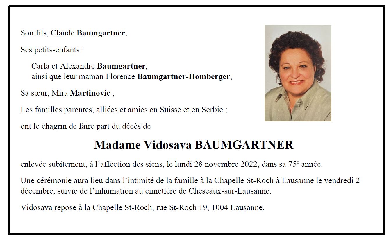 Madame Vidosava BAUMGARTNER 06 aoû. 1948 - 28 nov. 2022 Avis mortuaire PFG Télecharger PDF Partager sur: Galerie PreviousNext PreviousNext