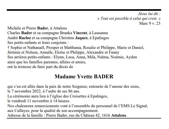 Madame Yvette BADER 12 nov. 1936 - 07 nov. 2022 Avis mortuaire PFG Télecharger PDF Partager sur: Galerie PreviousNext PreviousNext
