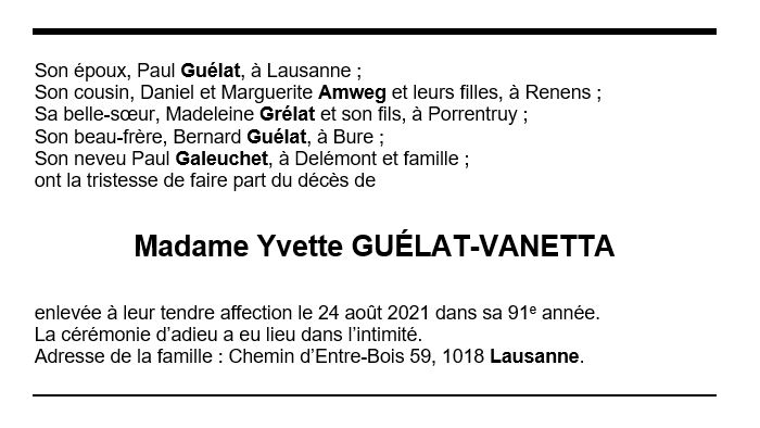 Madame Yvette GUÉLAT 03 mar. 1931 - 24 aoû. 2021 Avis mortuaire PFG Télecharger PDF Partager sur: Galerie PreviousNext PreviousNext