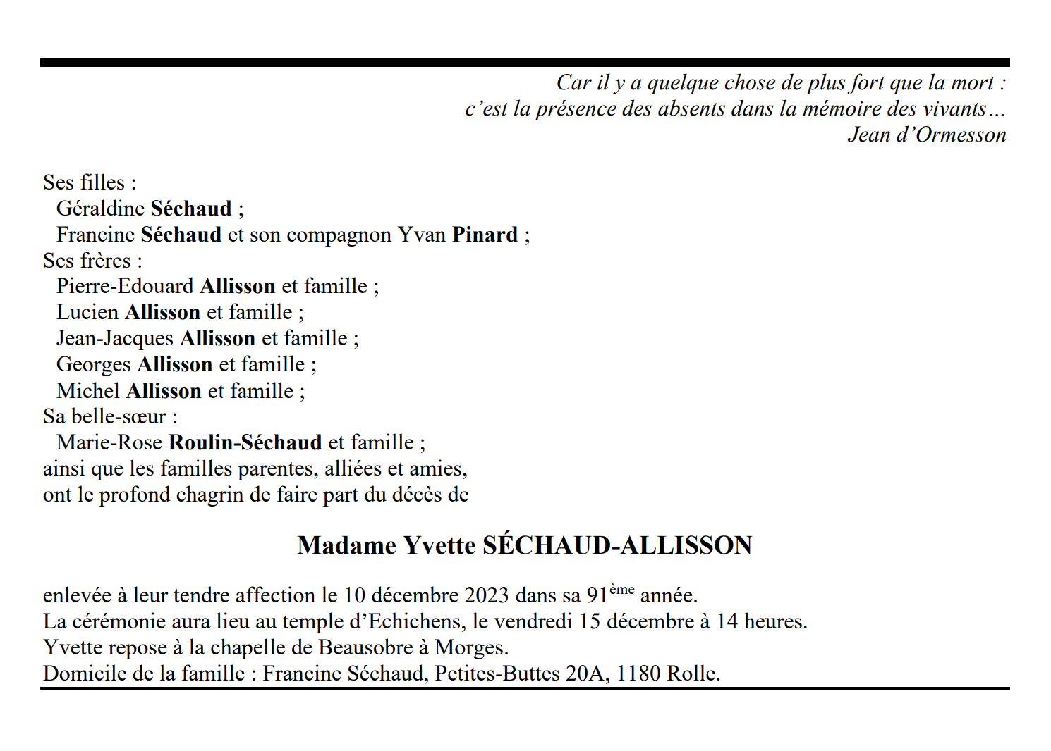 Madame Yvette SÉCHAUD-ALLISSON 22 mai. 1933 - 10 déc. 2023 Avis mortuaire PFG Télecharger PDF Partager sur: Galerie PreviousNext PreviousNext