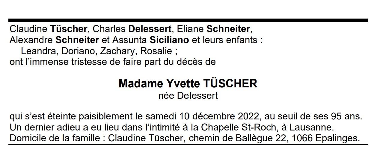 Madame Yvette TÜSCHER 18 déc. 1927 - 10 déc. 2022 Avis mortuaire PFG Télecharger PDF Partager sur: Galerie PreviousNext PreviousNext