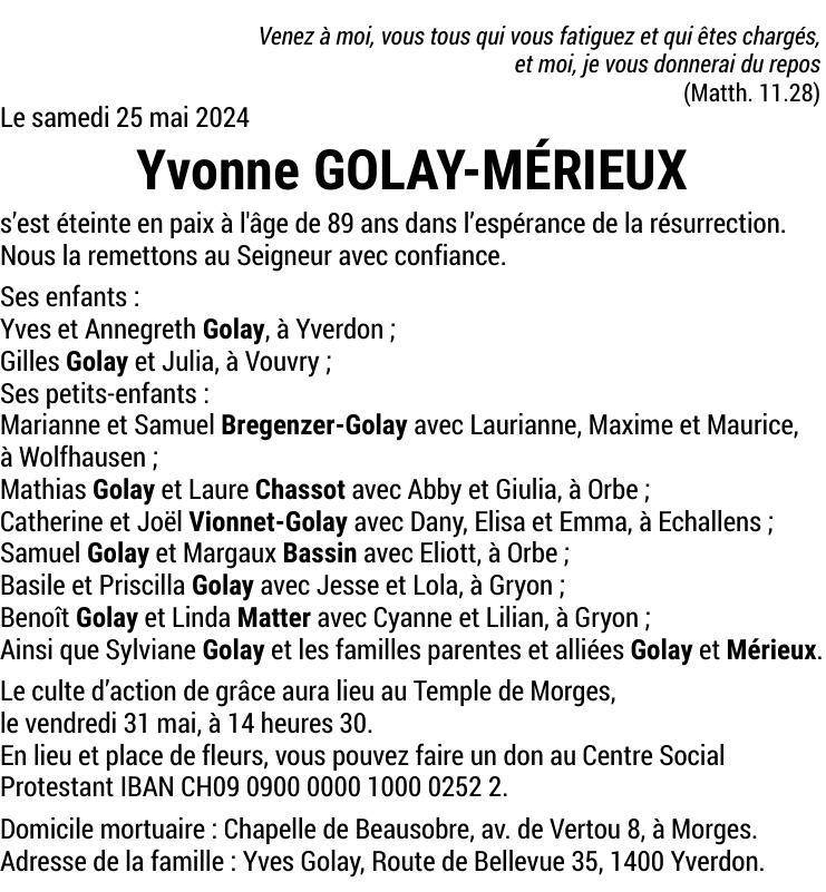 Madame Yvonne GOLAY 21 mar. 1935 - 25 mai. 2024 Avis mortuaire PFG Partager sur: Galerie PreviousNext PreviousNext
