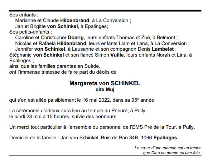 Margareta von SCHINKEL 08 nov. 1927 - 16 mai. 2022 Avis mortuaire PFG Télecharger PDF Partager sur: Galerie PreviousNext PreviousNext