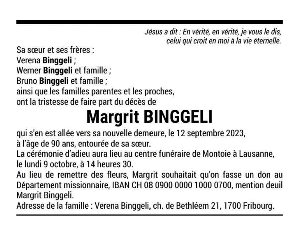 Margrit BINGGELI 22 juin. 1933 - 12 sep. 2023 Avis mortuaire PFG Télecharger PDF Partager sur: Galerie PreviousNext PreviousNext