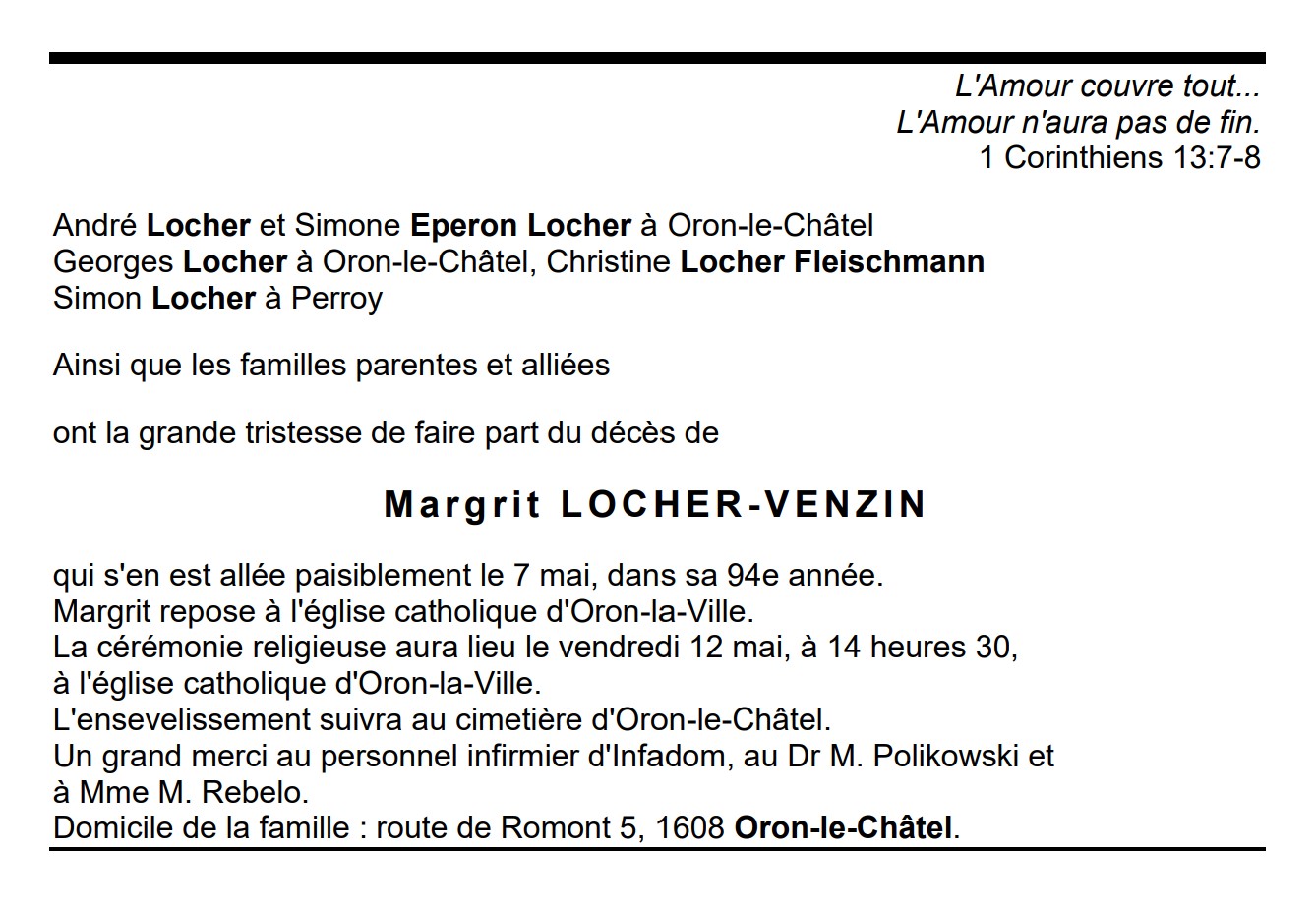 Margrit LOCHER-VENZIN 07 sep. 1929 - 07 mai. 2023 Avis mortuaire PFG Télecharger PDF Partager sur: Galerie PreviousNext PreviousNext