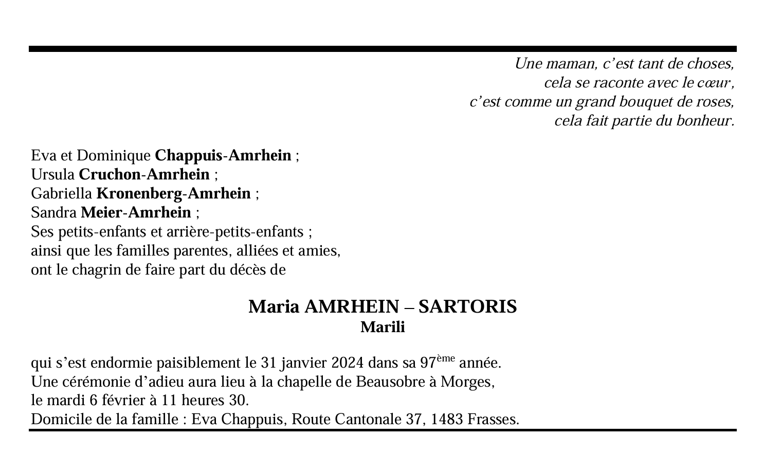 Maria AMRHEIN – SARTORIS Marili 01 juin. 1927 - 31 jan. 2024 Avis mortuaire PFG Télecharger PDF Partager sur: Galerie PreviousNext PreviousNext