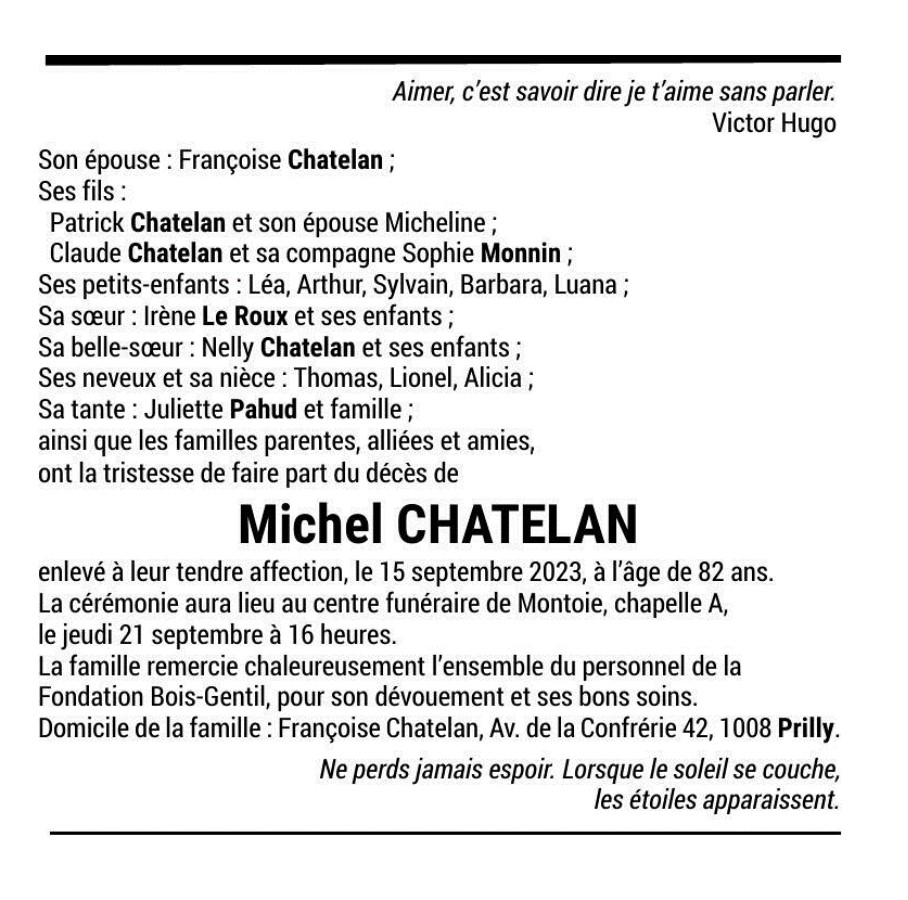 Michel CHATELAN 03 jan. 1941 - 15 sep. 2023 Avis mortuaire PFG Télecharger PDF Partager sur: Galerie PreviousNext PreviousNext