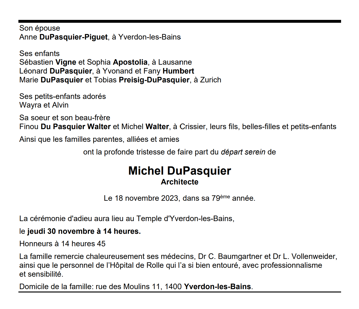Michel DuPasquier Architecte 03 oct. 1945 - 18 nov. 2023 Avis mortuaire PFG Télecharger PDF Partager sur: Galerie PreviousNext PreviousNext