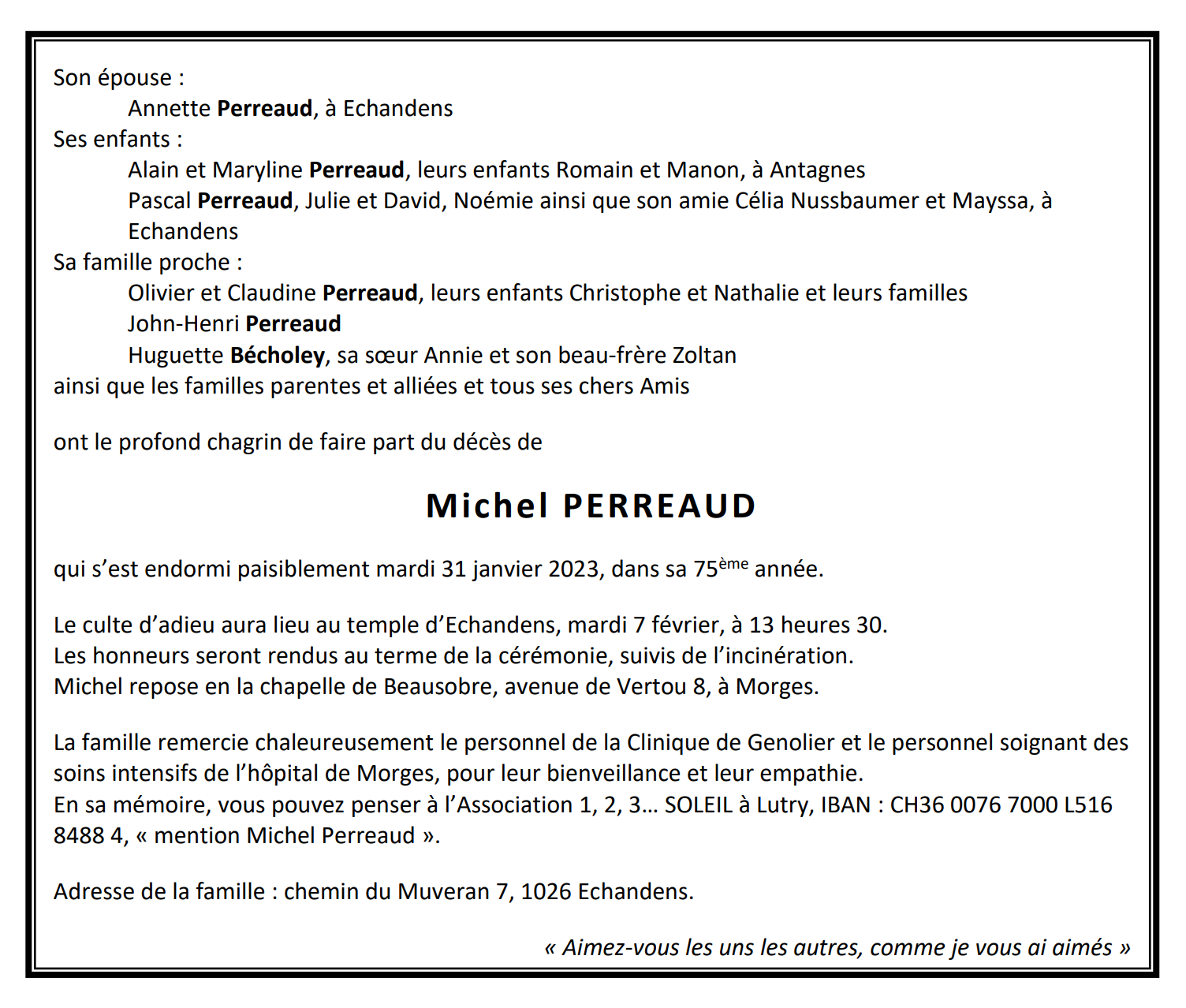 Michel PERREAUD 06 juin. 1948 - 31 jan. 2023 Avis mortuaire PFG Télecharger PDF Partager sur: Galerie PreviousNext PreviousNext