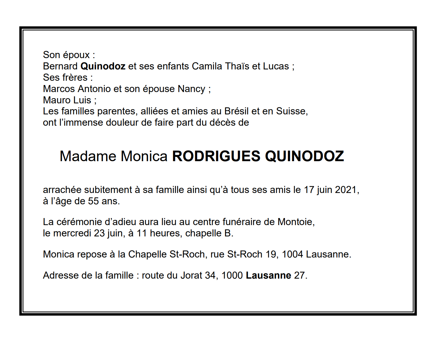 Monica RODRIGUES QUINODOZ 17 avr. 1966 - 17 juin. 2021 Avis mortuaire PFG Télecharger PDF Partager sur: Galerie PreviousNext PreviousNext