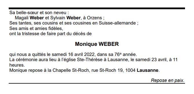 Monique WEBER 28 oct. 1946 - 16 avr. 2022 Avis mortuaire PFG Télecharger PDF Partager sur: Galerie PreviousNext PreviousNext