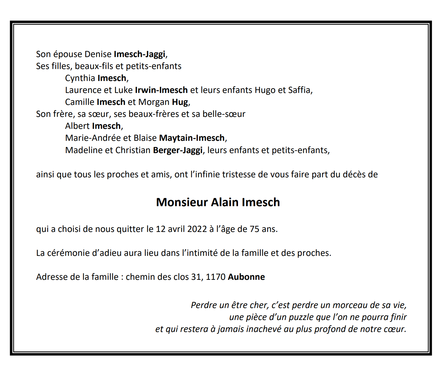Monsieur Alain Imesch 04 mar. 1947 - 13 avr. 2022 Avis mortuaire PFG Télecharger PDF Partager sur: Galerie PreviousNext PreviousNext