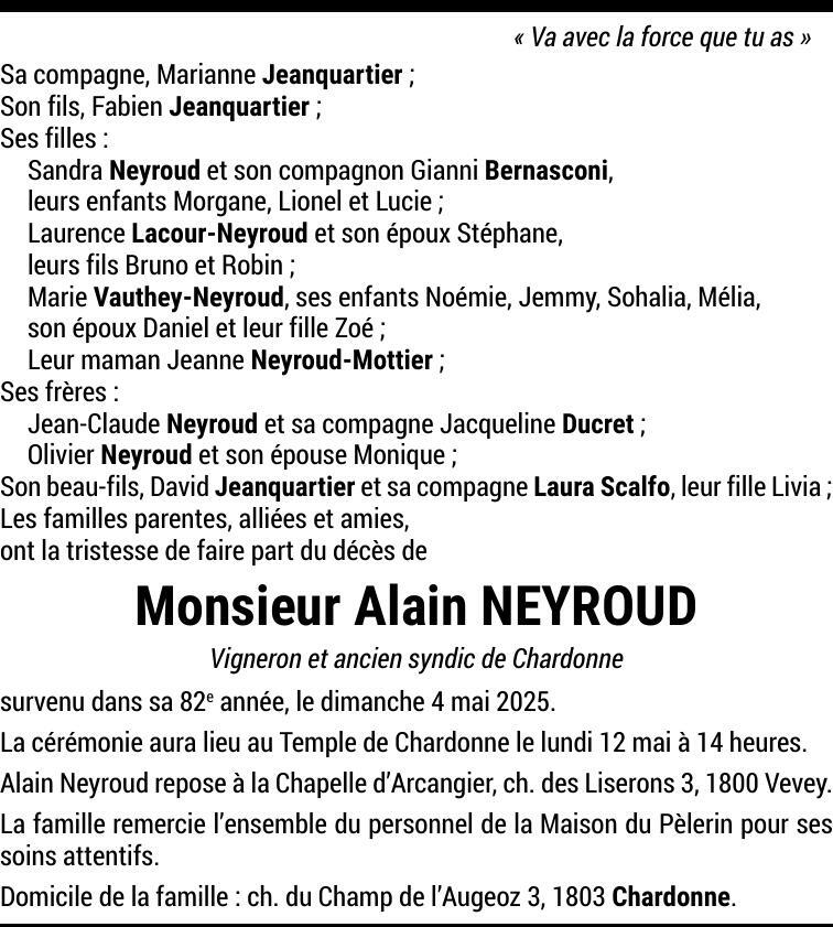 Monsieur Alain NEYROUD 27 aoû. 1943 - 04 mai. 2025 Avis mortuaire PFG Partager sur: Galerie PreviousNext PreviousNext