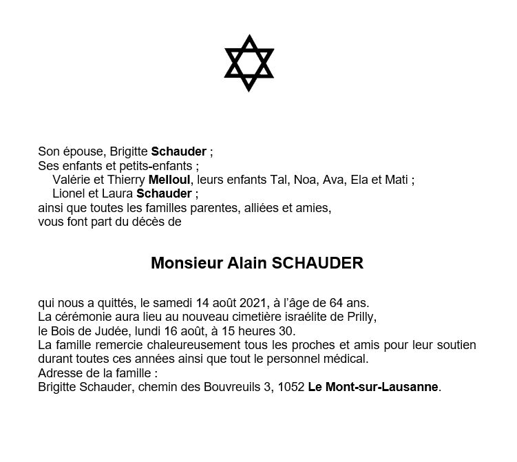 Monsieur Alain SCHAUDER 20 mai. 1957 - 14 aoû. 2021 Avis mortuaire PFG Télecharger PDF Partager sur: Galerie PreviousNext PreviousNext