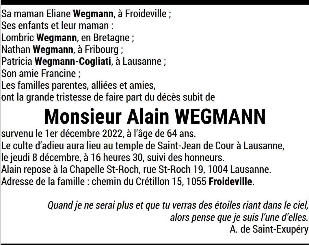 Monsieur Alain WEGMANN 17 mar. 1958 - 01 déc. 2022 Avis mortuaire PFG Télecharger PDF Partager sur: Galerie PreviousNext PreviousNext