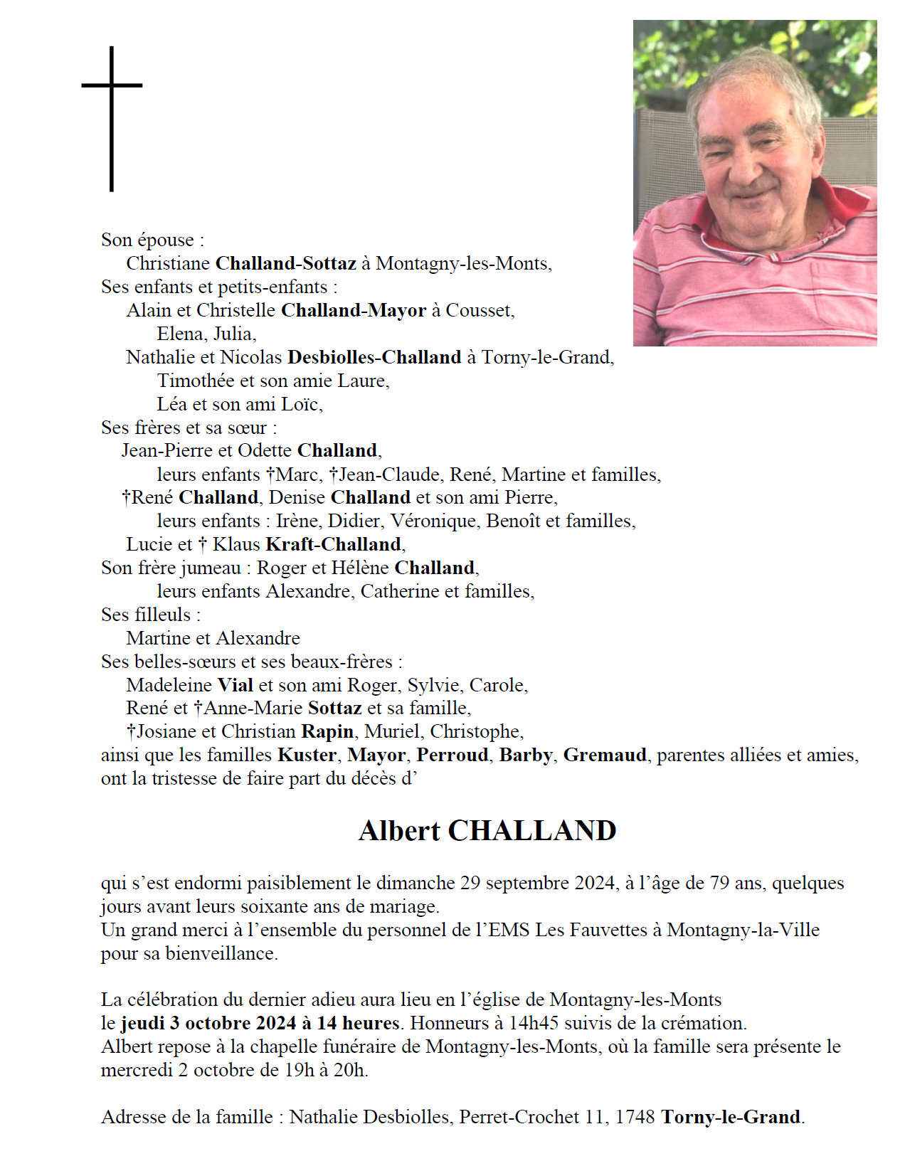 Monsieur Albert CHALLAND 11 juil. 1945 - 29 sep. 2024 Avis mortuaire PFG Télecharger PDF Partager sur: Galerie