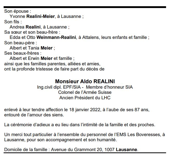 Monsieur Aldo REALINI 19 fév. 1935 - 18 jan. 2022 Avis mortuaire PFG Télecharger PDF Partager sur: Galerie PreviousNext PreviousNext