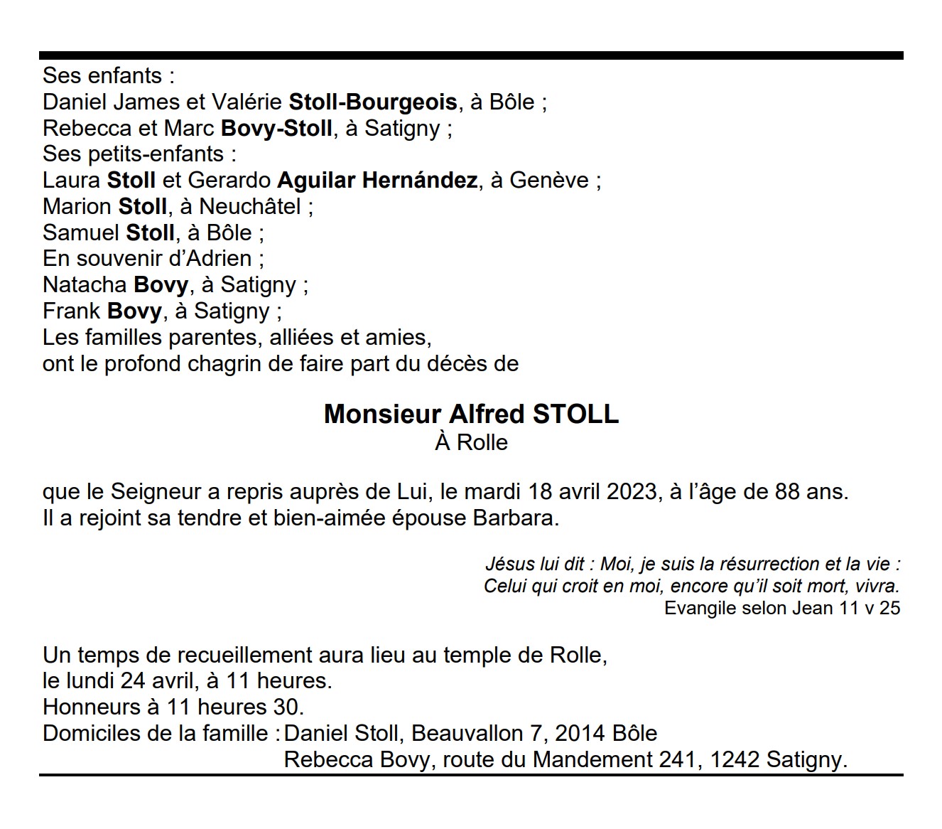 Monsieur Alfred STOLL à Genève 17 avr. 1935 - 18 avr. 2023 Avis mortuaire PFG Télecharger PDF Partager sur: Galerie PreviousNext PreviousNext