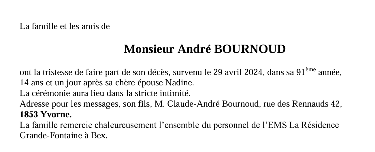Monsieur André BOURNOUD 09 juil. 1933 - 29 avr. 2024 Avis mortuaire PFG Télecharger PDF Partager sur: Galerie