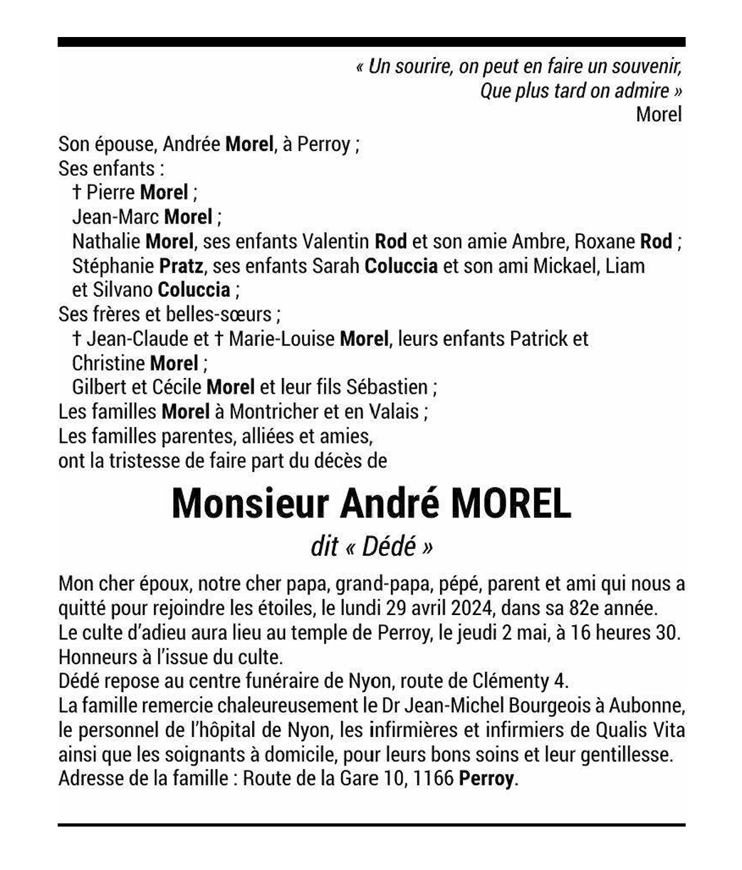 Monsieur André MOREL dit « Dédé » 30 juin. 1942 - 29 avr. 2024 Avis mortuaire PFG Télecharger PDF Partager sur: Galerie PreviousNext PreviousNext