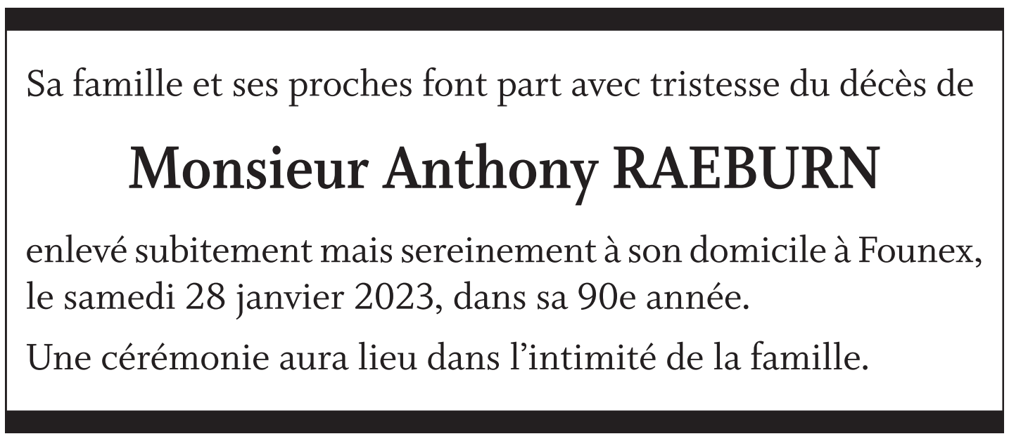 Monsieur Anthony RAEBURN 28 oct. 1933 - 28 jan. 2023 Avis mortuaire PFG Télecharger PDF Partager sur: Galerie