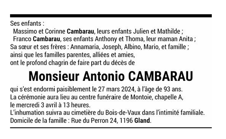 Monsieur Antonio CAMBARAU 25 fév. 1931 - 27 mar. 2024 Avis mortuaire PFG Télecharger PDF Partager sur: Galerie PreviousNext PreviousNext