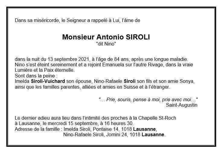 Monsieur Antonio SIROLI 20 nov. 1937 - 13 sep. 2021 Avis mortuaire PFG Télecharger PDF Partager sur: Galerie PreviousNext PreviousNext