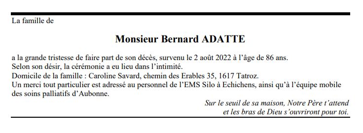 Monsieur Bernard ADATTE 19 juin. 1936 - 02 aoû. 2022 Avis mortuaire PFG Télecharger PDF Partager sur: Galerie PreviousNext PreviousNext