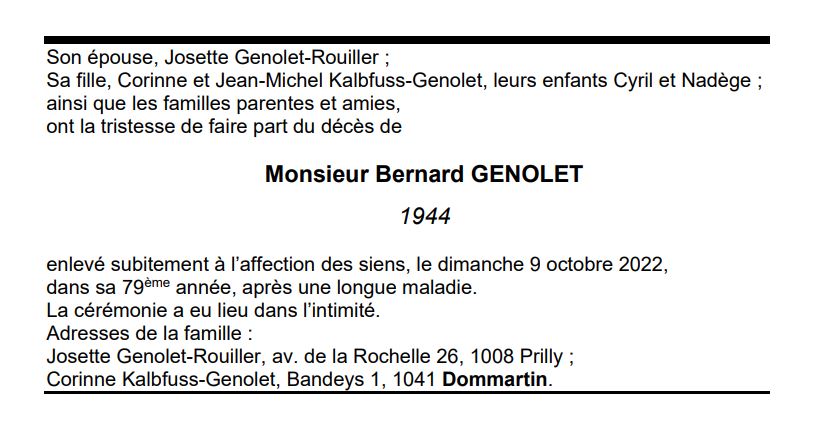 Monsieur Bernard GENOLET 01 jan. 1944 - 09 oct. 2022 Avis mortuaire PFG Télecharger PDF Partager sur: Galerie PreviousNext PreviousNext
