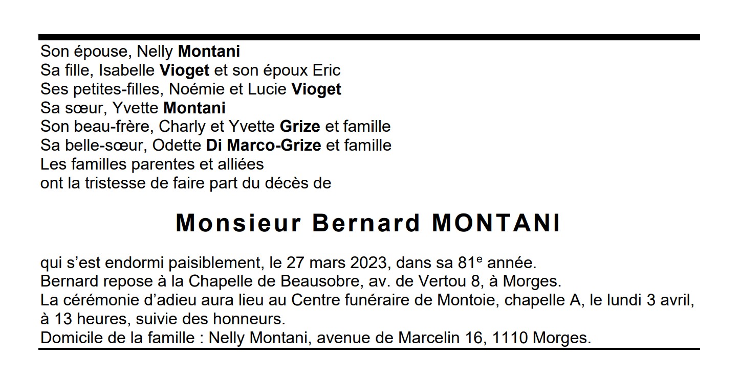 Monsieur Bernard MONTANI 26 juil. 1942 - 27 mar. 2023 Avis mortuaire PFG Télecharger PDF Partager sur: Galerie PreviousNext PreviousNext