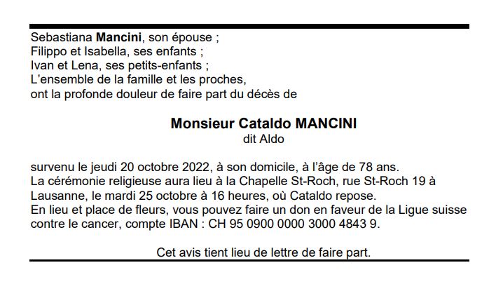 Monsieur Cataldo MANCINI dit Aldo 09 aoû. 1944 - 20 oct. 2022 Avis mortuaire PFG Télecharger PDF Partager sur: Galerie PreviousNext PreviousNext