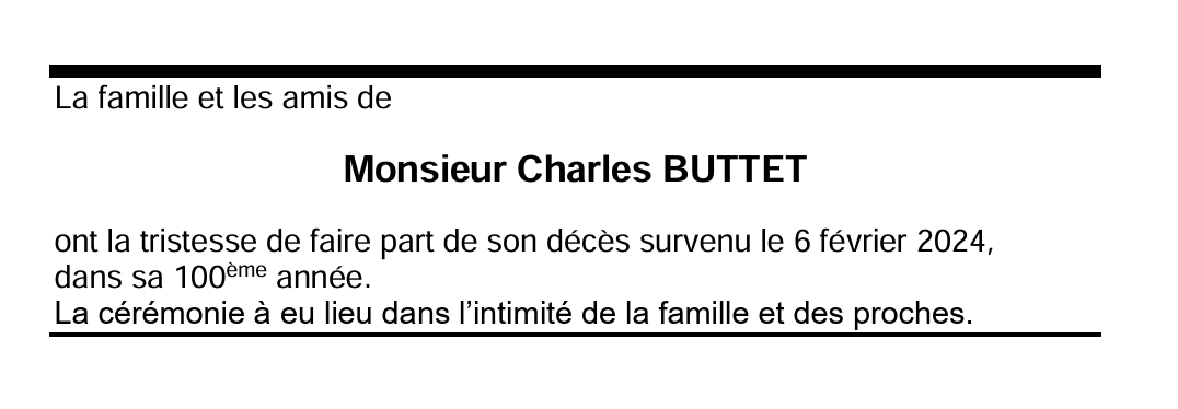 Monsieur Charles BUTTET 06 oct. 1924 - 06 fév. 2024 Avis mortuaire PFG Télecharger PDF Partager sur: Galerie PreviousNext PreviousNext