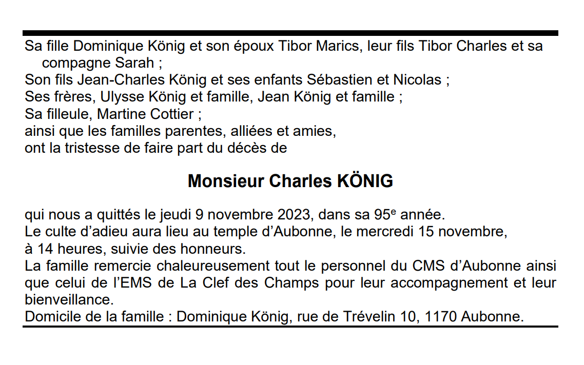 Monsieur Charles KÖNIG 02 fév. 1929 - 09 nov. 2023 Avis mortuaire PFG Télecharger PDF Partager sur: Galerie PreviousNext PreviousNext