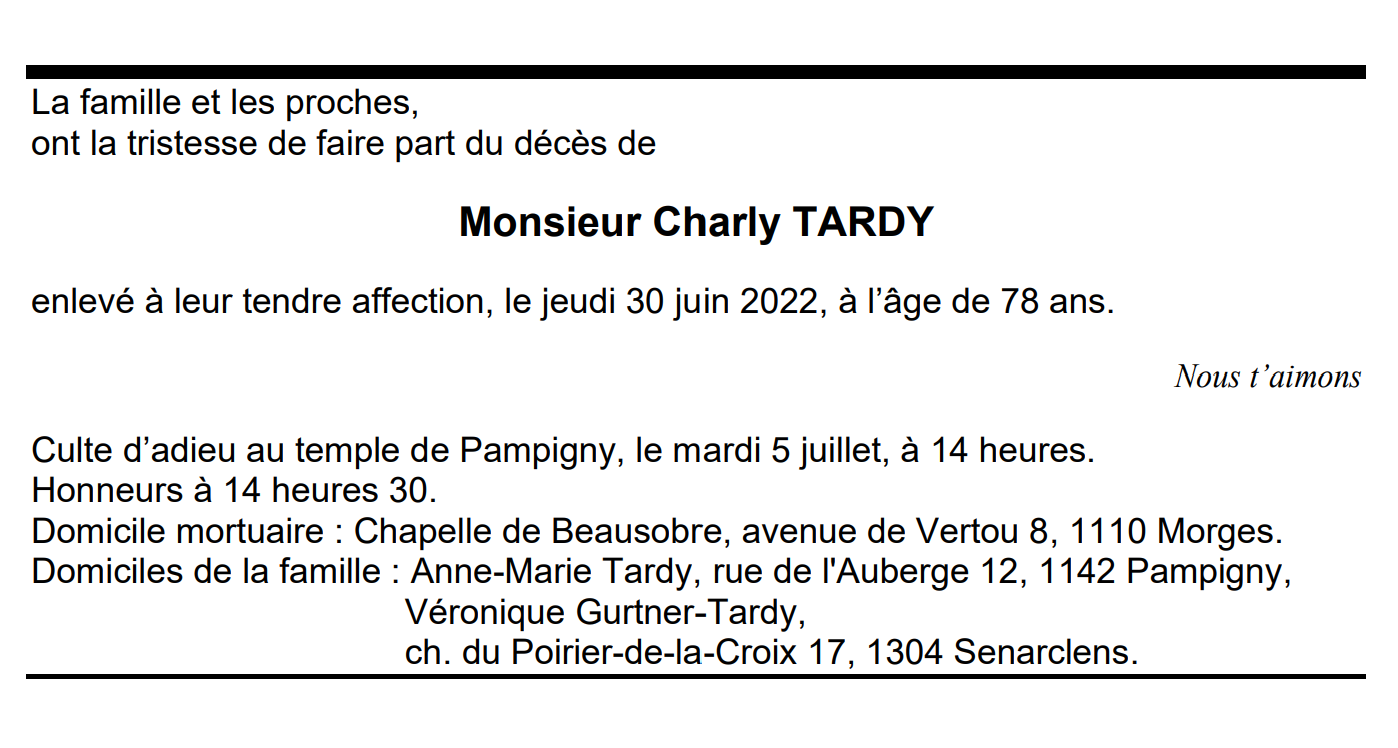 Monsieur Charly TARDY 01 oct. 1943 - 30 juin. 2022 Avis mortuaire PFG Télecharger PDF Partager sur: Galerie PreviousNext PreviousNext