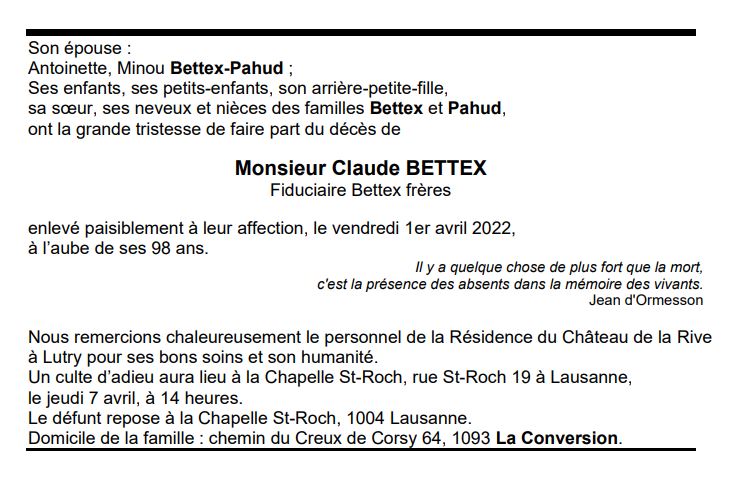 Monsieur Claude BETTEX 20 avr. 1924 - 01 avr. 2022 Avis mortuaire PFG Télecharger PDF Partager sur: Galerie PreviousNext PreviousNext