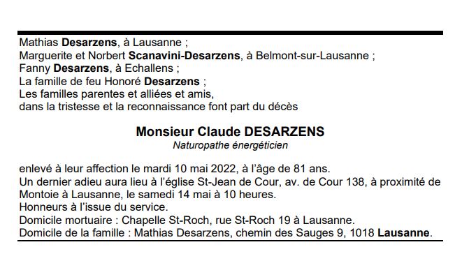 Monsieur Claude DESARZENS 19 mar. 1941 - 10 mai. 2022 Avis mortuaire PFG Télecharger PDF Partager sur: Galerie PreviousNext PreviousNext