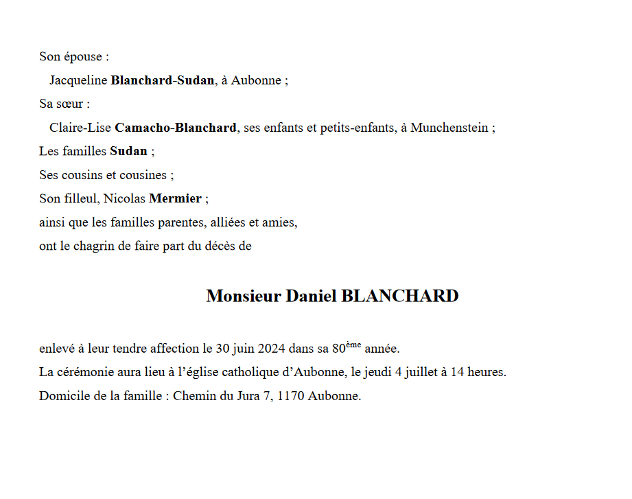 Monsieur Daniel BLANCHARD 16 déc. 1944 - 30 juin. 2024 Avis mortuaire PFG Télecharger PDF Partager sur: Galerie