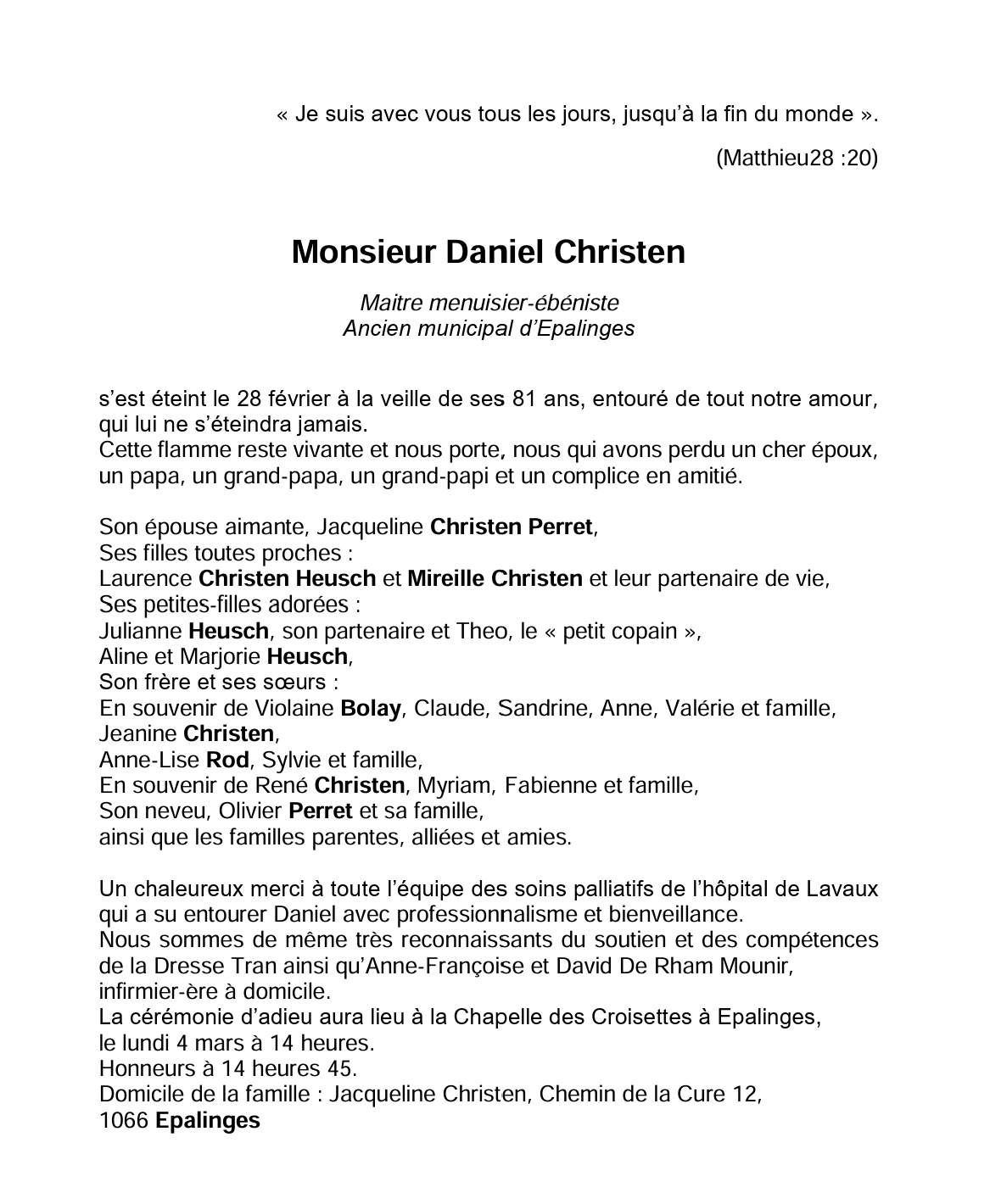 Monsieur Daniel Christen 01 avr. 1943 - 28 fév. 2024 Avis mortuaire PFG Télecharger PDF Partager sur: Galerie PreviousNext PreviousNext
