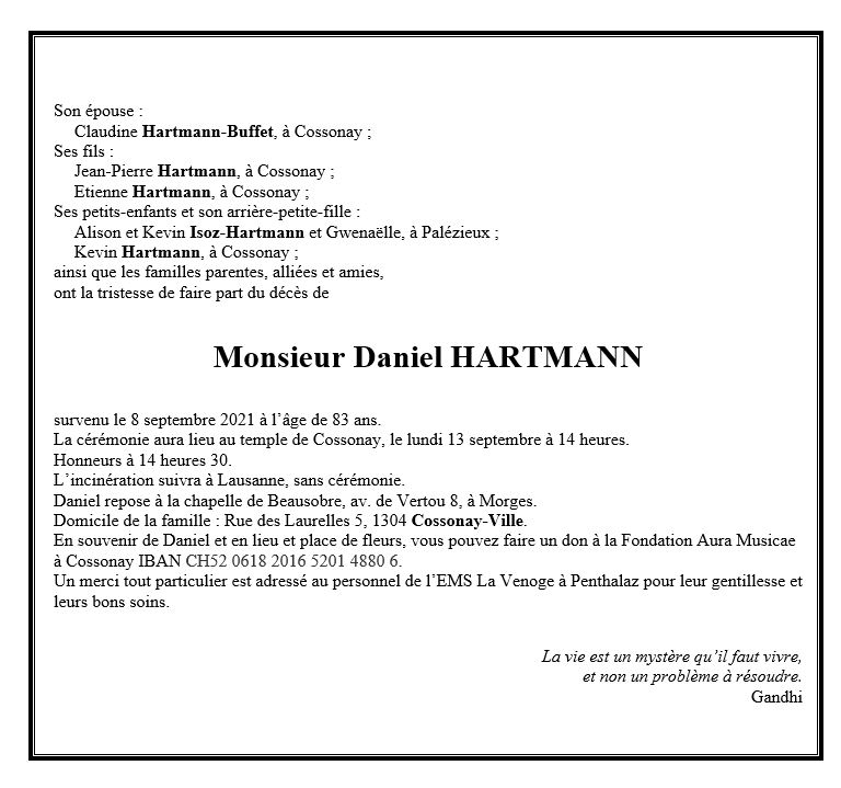 Monsieur Daniel HARTMANN 20 avr. 1938 - 08 sep. 2021 Avis mortuaire PFG Télecharger PDF Partager sur: Galerie PreviousNext PreviousNext