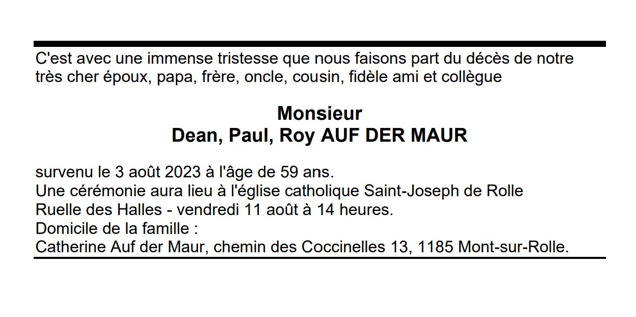 Monsieur Dean, Paul, Roy AUF DER MAUR 15 jan. 1964 - 03 aoû. 2023 Avis mortuaire PFG Télecharger PDF Partager sur: Galerie PreviousNext PreviousNext