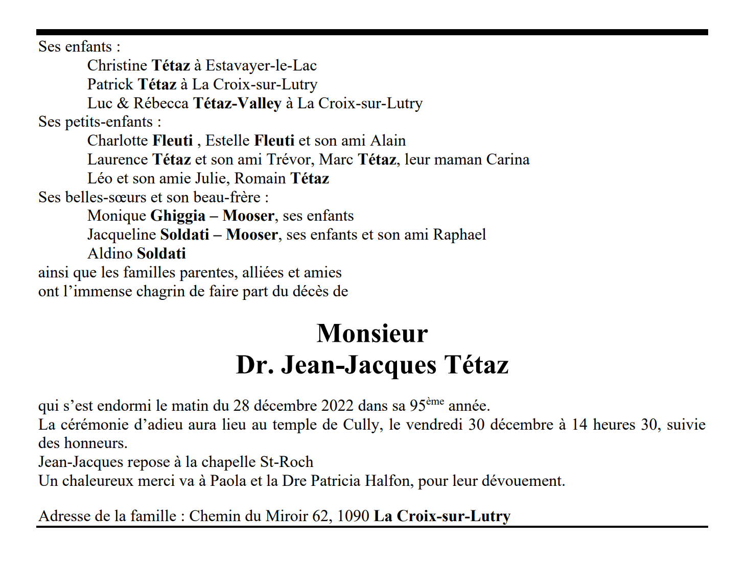 Monsieur Dr. Jean-Jacques Tétaz 04 avr. 1928 - 28 déc. 2022 Avis mortuaire PFG Télecharger PDF Partager sur: Galerie PreviousNext PreviousNext