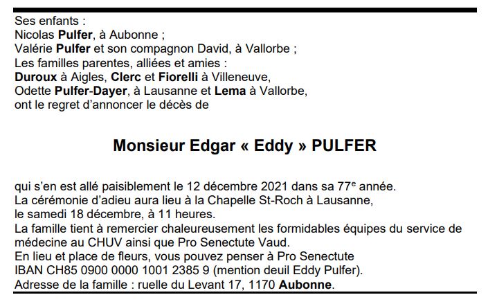 Monsieur Edgar « Eddy » PULFER 21 jan. 1945 - 12 déc. 2021 Avis mortuaire PFG Télecharger PDF Partager sur: Galerie PreviousNext PreviousNext
