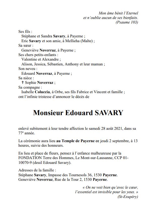 Monsieur Edouard SAVARY 16 nov. 1944 - 28 aoû. 2021 Avis mortuaire PFG Télecharger PDF Partager sur: Galerie PreviousNext PreviousNext