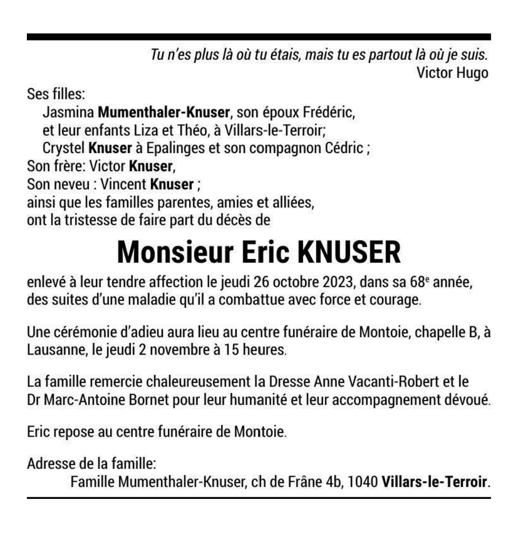 Monsieur Eric KNUSER 01 juin. 1956 - 26 oct. 2023 Avis mortuaire PFG Télecharger PDF Partager sur: Galerie PreviousNext PreviousNext