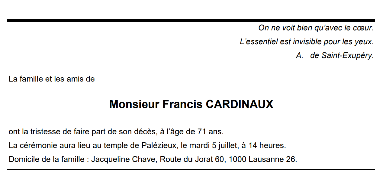 Monsieur Francis CARDINAUX 01 avr. 1951 - 23 juin. 2022 Avis mortuaire PFG Télecharger PDF Partager sur: Galerie PreviousNext PreviousNext